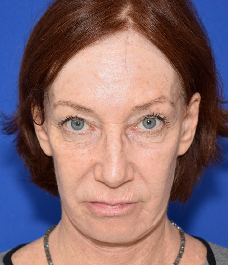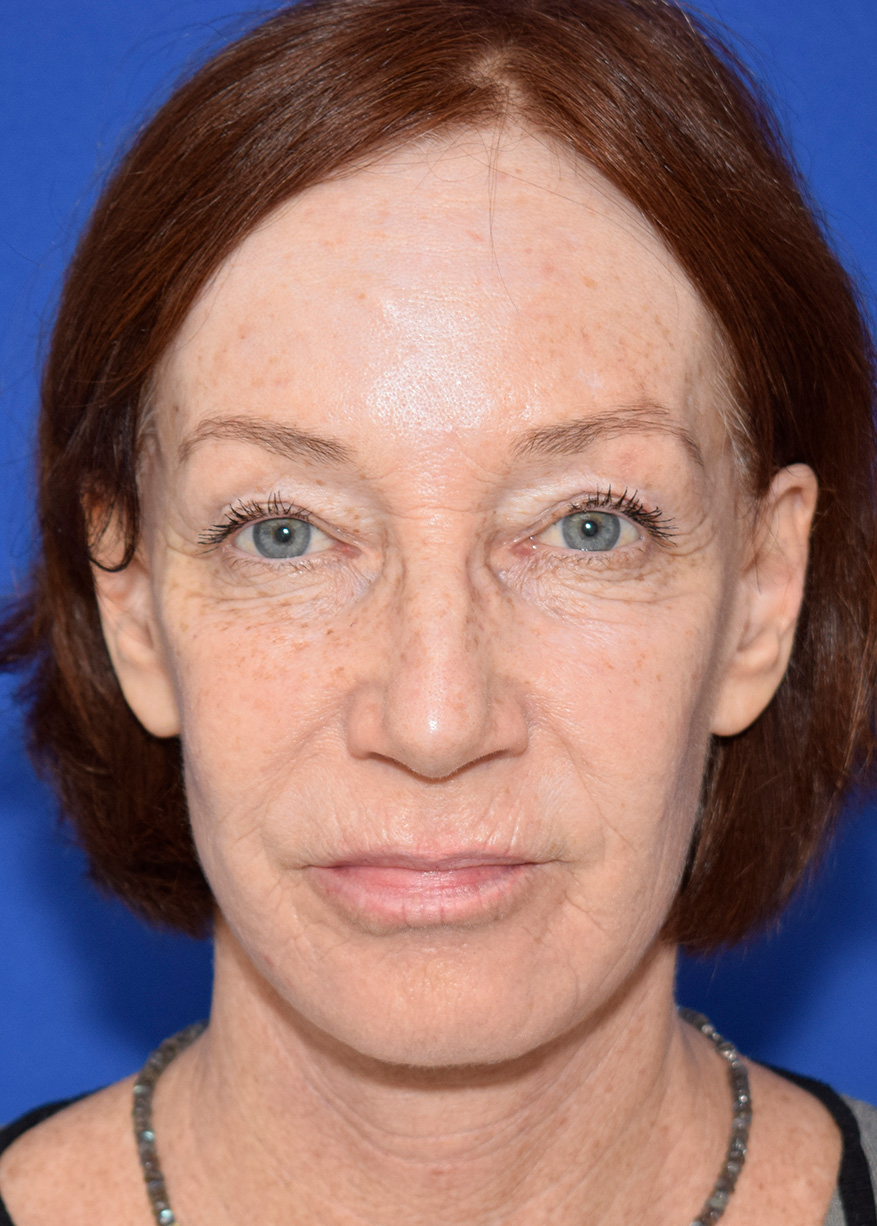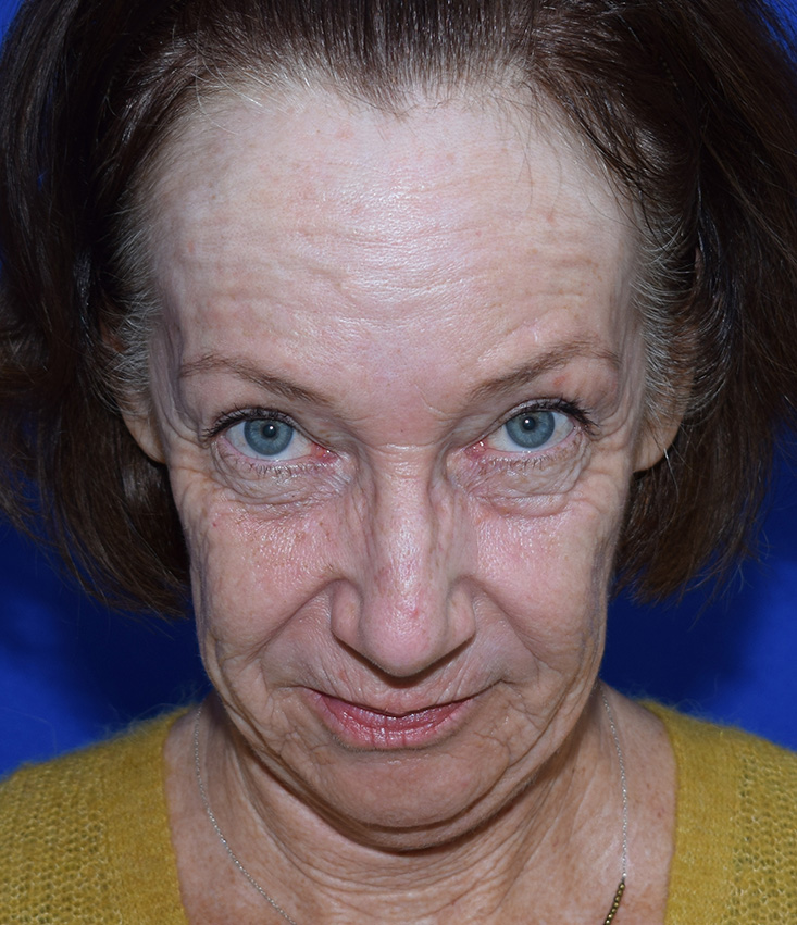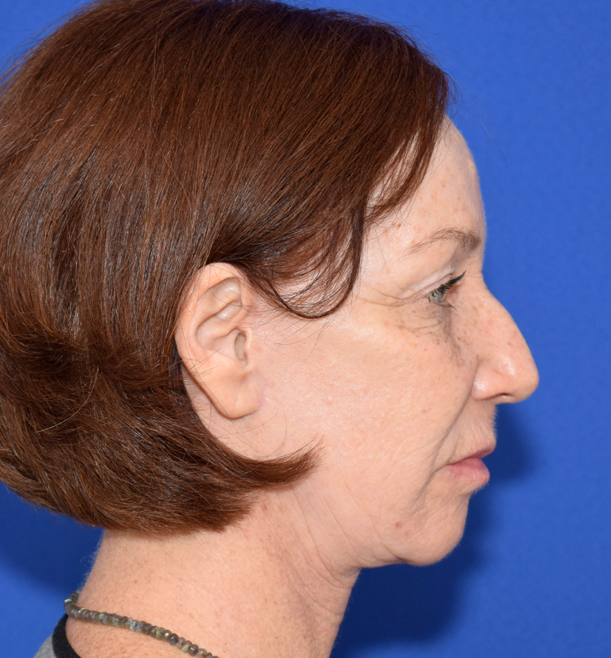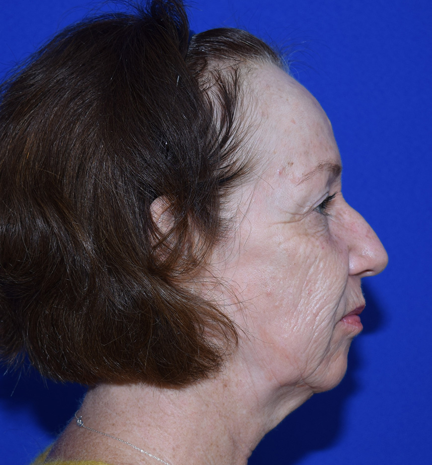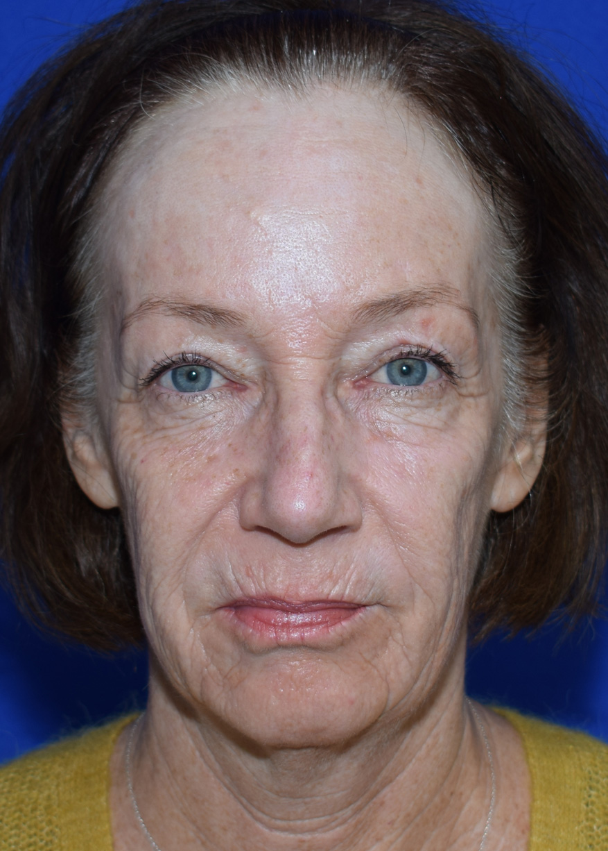 The patient was affected by aging changes in her face and neck. A thread lift performed elsewhere did not provide satisfactory improvement in tissue sagging. Her upper eyelids had been lifted three years prior at another facility. The patient stated that she wanted the facelift for herself, for her sense of well-being, and to enjoy looking in the mirror again in the morning.